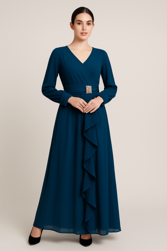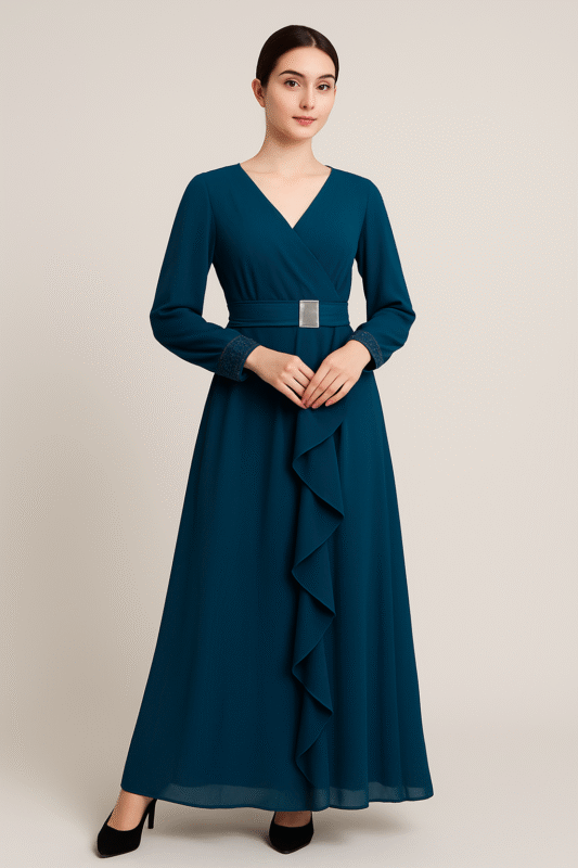 Teal Blue Long Sleeve Belted Ruffle Maxi Dress