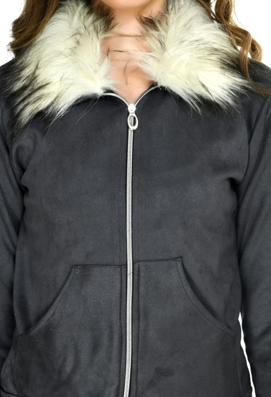 The Women Dark Gray Velvet Fur Winter Jacket is a versatile and elegant winterwear choice for women who love neutral shades with a luxurious feel. Crafted with super soft velvet and finished with fur detailing on the collar and sleeve ends, this jacket delivers both comfort and sophistication. The dark gray color makes it highly versatile, pairing effortlessly with almost any outfit, whether jeans, trousers, or skirts. This jacket features a smooth front zipper, full sleeves, and functional pockets, making it both stylish and practical. The fur lining around the neckline adds extra warmth and gives the jacket a fashionable edge, making it ideal for casual outings, office wear, and winter travel. Its lightweight design ensures ease of movement while still keeping you cozy. The velvet fabric feels soft against the skin and remains shiny and rich even after repeated washes if proper care is taken. The dark gray color is subtle yet chic, making it suitable for women of all ages who prefer understated elegance. Keywords: dark gray velvet jacket women, fur collar winter hoodie, stylish warm outerwear, velvet zipper jacket for girls, women’s soft fur velvet hoodie.