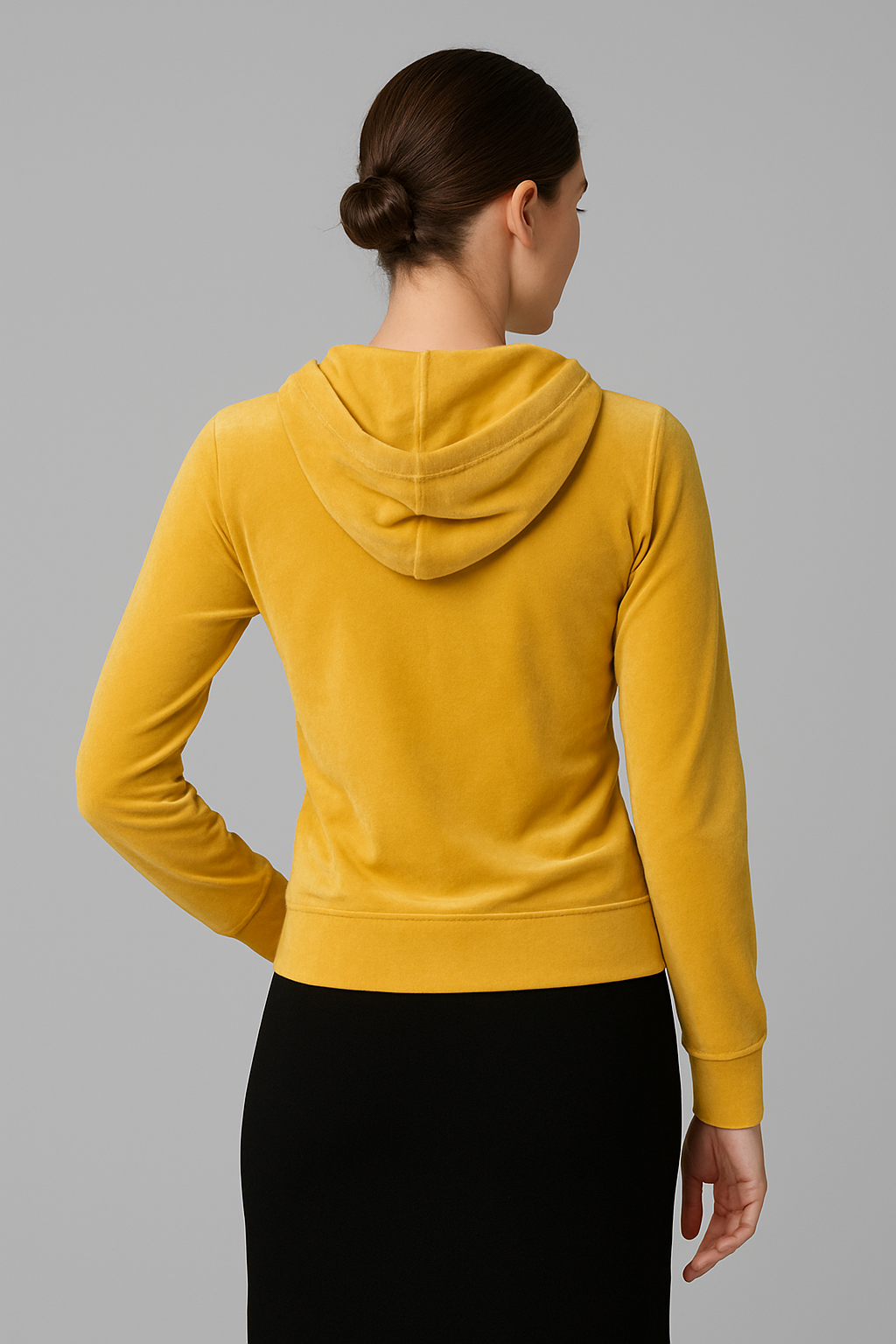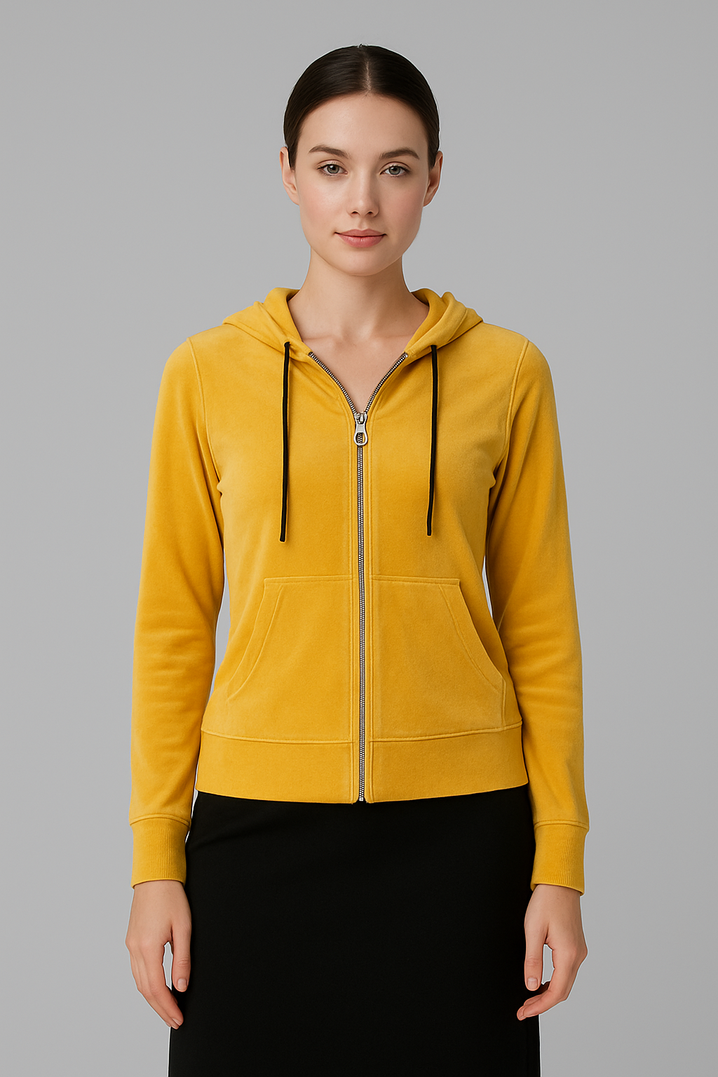 This Women’s Mustard Yellow Velour Zipper Hoodie is perfect for winter and cool weather. It is made from soft and high-quality velour fabric, which feels smooth on the skin and keeps you warm without feeling heavy. The beautiful mustard yellow color gives a stylish and fresh look, making it easy to match with different outfits. The hoodie has a slim-fit design that shapes your body nicely. It comes with a silver front zipper, full sleeves with ribbed cuffs, and a ribbed waistband to keep the warmth inside. The attached hood has black drawstrings for a modern and sporty touch.