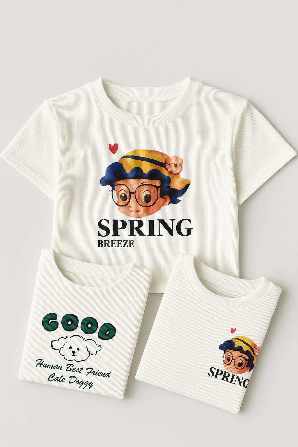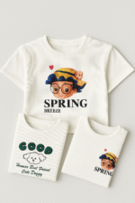 Bring cuteness and comfort to your wardrobe with this Women’s Printed Ribbed Cotton T-Shirt Combo. Designed for girls and ladies who love stylish yet comfortable outfits, this combo includes three different printed T-shirts in one pack. Each T-shirt has its own unique design – a colorful cartoon face wearing a hat, an adorable dog illustration, and a minimal cartoon face print. Whether you want to look playful, sweet, or casual, you’ll find the perfect match in this set.