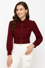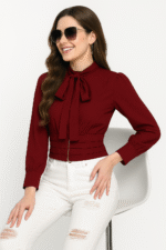 This red maroon ruffle sleeve crop top for women is designed to bring out a perfect blend of elegance and comfort for modern girls and women who love to experiment with stylish western wear. Made with premium quality fabric, the top offers a smooth touch and a breathable experience that keeps you comfortable throughout the day while ensuring you look fashionable on every occasion. The rich red maroon shade adds depth and sophistication to your wardrobe, making it a versatile piece that pairs beautifully with jeans, skirts, or trousers. Its crop length makes it ideal for casual outings, parties, or even special evening events where you want to make a lasting impression. The ruffle detailing on the sleeves creates a playful yet graceful touch, enhancing the overall feminine charm of the outfit. The top is stitched in a way that complements every body shape, hugging the waist with a neat pleated style for a flattering silhouette. Whether you are heading to a brunch, an office get-together, or a college party, this top serves as a reliable option for all settings. The fabric is wrinkle-resistant, so you can wear it without worrying about constant ironing, making it travel-friendly and low-maintenance. With its fashionable neckline, the design stays trendy and evergreen, giving you endless options to accessorize it with necklaces, hoops, or stylish handbags. Pair this red maroon cro