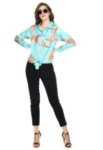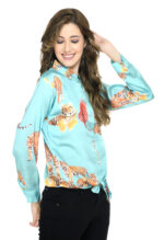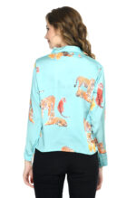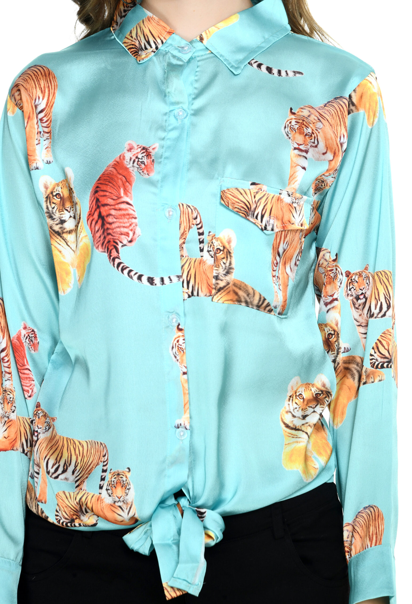 The sky blue tiger print satin tie knot shirt for women is a bold yet classy fashion statement, perfect for young and modern women who love experimenting with their style. Crafted from soft and shiny satin fabric, this shirt brings comfort and glamour together. The sky blue base color is soothing and fashionable, and the bold tiger print gives it a confident and stylish edge. Featuring a classic collar, button-down front, and trendy tie-knot closure, this shirt is designed for casual, party, and semi-formal looks.