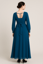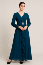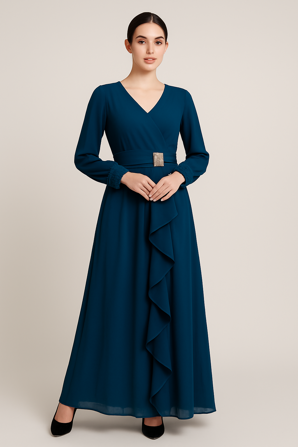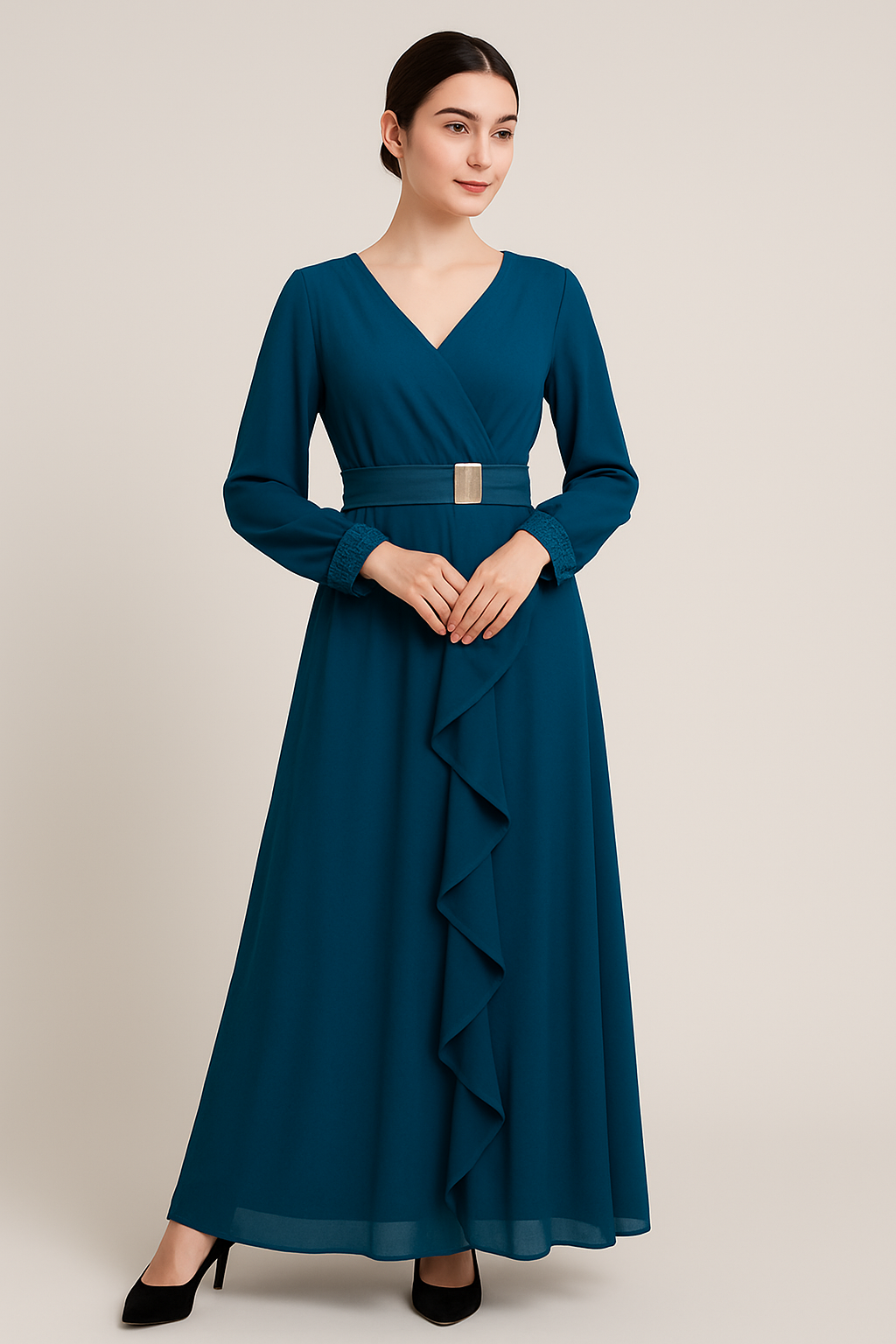 Teal blue party gown, blue maxi dress for women, belted ruffle evening gown, wedding reception outfit, teal formal dress, long sleeve party wear dress, Gown blue, evening long gown for ladies, plus size gown option.