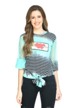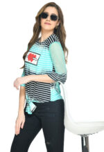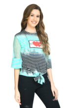 This turquoise striped casual top for women is a stylish addition to your western wear wardrobe. Made with soft, breathable fabric, it keeps you comfortable all day while giving a trendy and modern look. The turquoise and black striped pattern with a gradient touch makes the top stand out and adds freshness to your outfit.