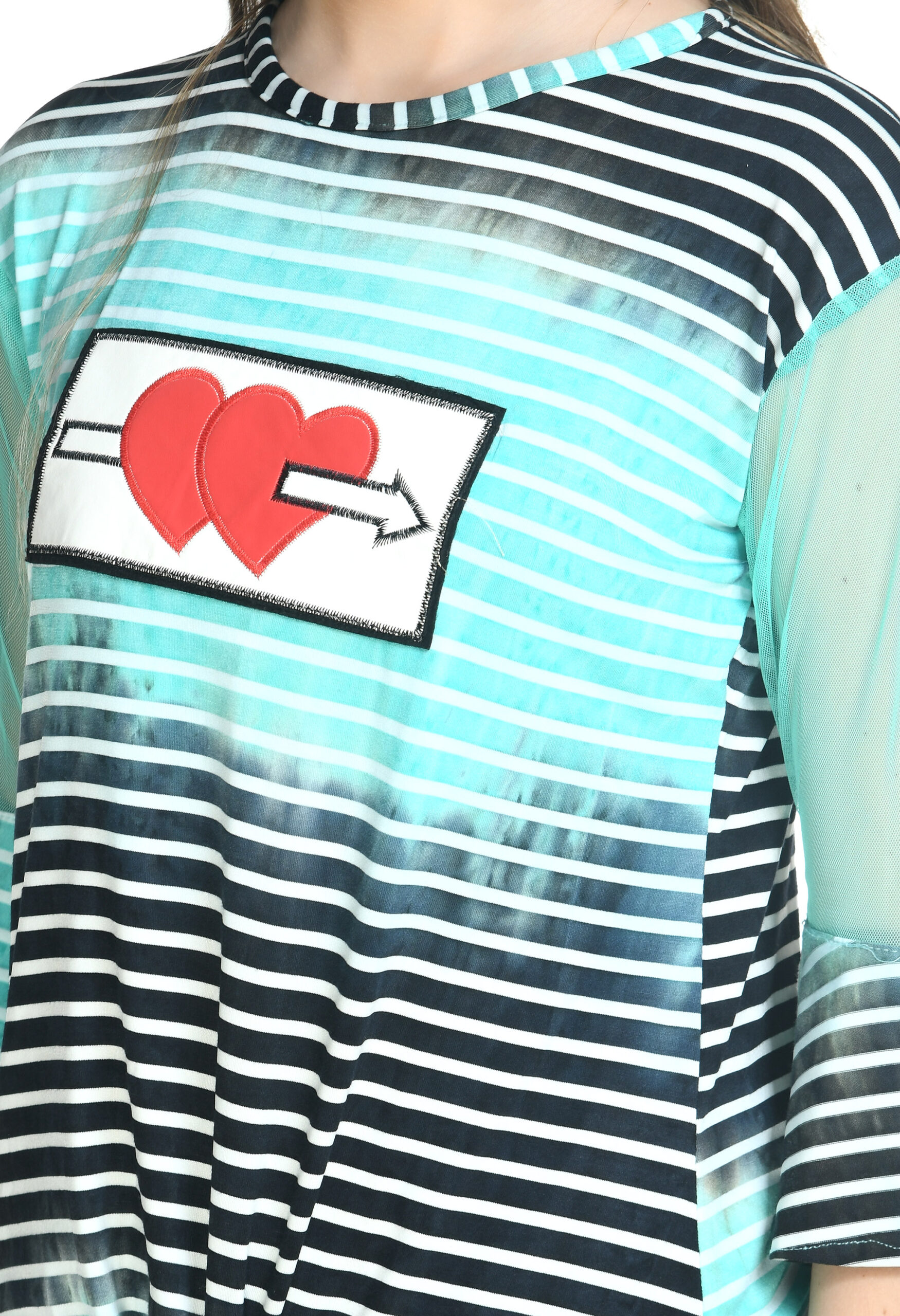 The front features a bold red heart patch with an arrow design, giving it a playful and youthful vibe. Designed with a round neck and half sleeves, it comes with net detailing on the arms that adds a fashionable touch. The knot tie-up at the hemline enhances the overall style and gives a flattering fit that suits different body types.