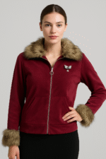 Made from premium-grade velvet, the jacket is soft to touch yet durable enough for long-term wear. The faux fur details are carefully stitched for a neat, high-end finish. The high-quality metal zipper runs smoothly, making it easy to wear and remove while maintaining a fashionable appearance. The rich burgundy shade is universally flattering and pairs effortlessly with multiple outfits.