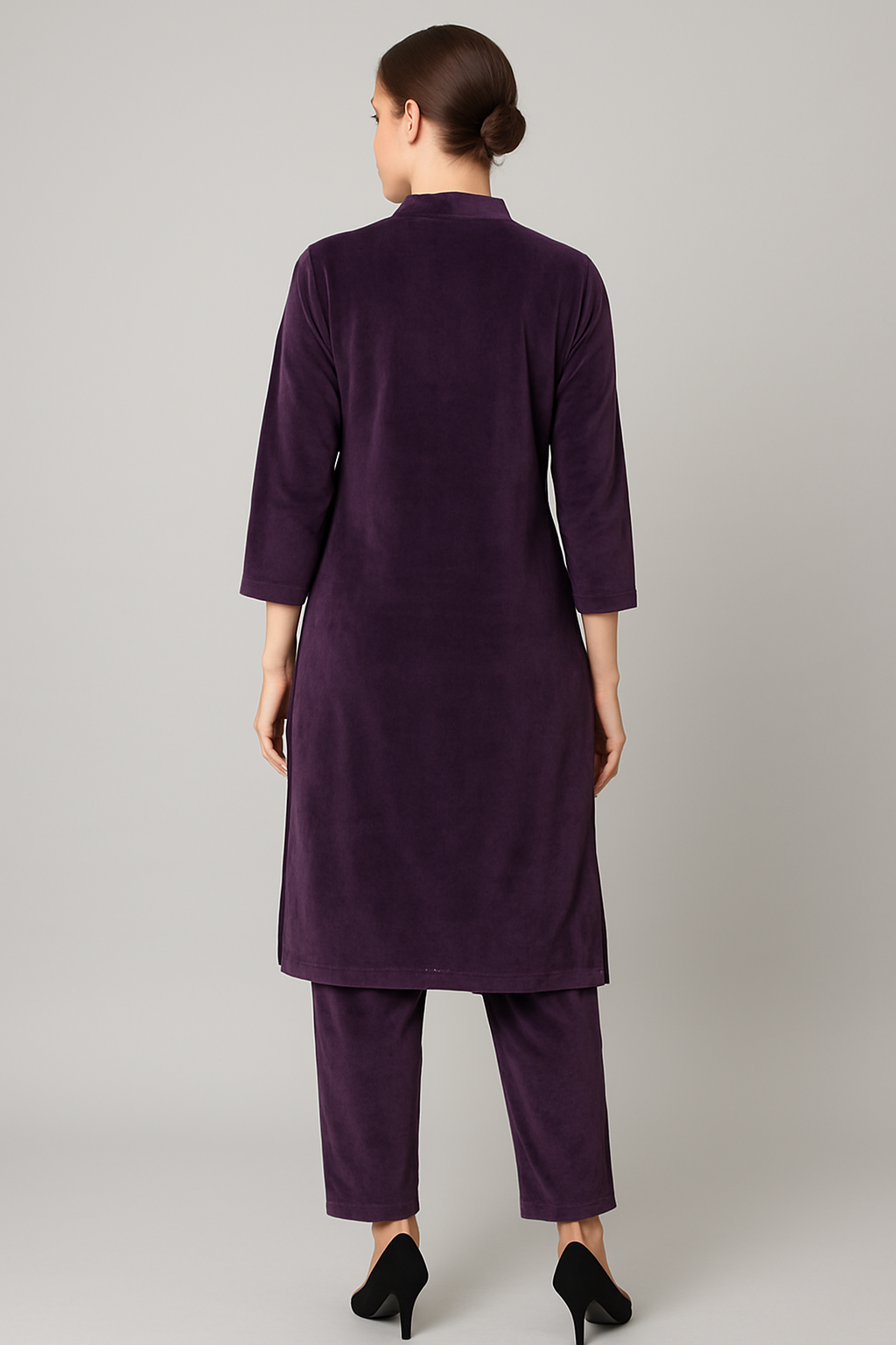 The set includes a straight-cut velvet kurti paired with matching pants, making it a complete outfit for daily wear, office, or small gatherings. The kurti features a mandarin collar with button placket for a sophisticated appeal, while the full sleeves provide extra coverage and warmth. A minimal embroidered motif on the chest adds a subtle yet classy touch to the overall design.